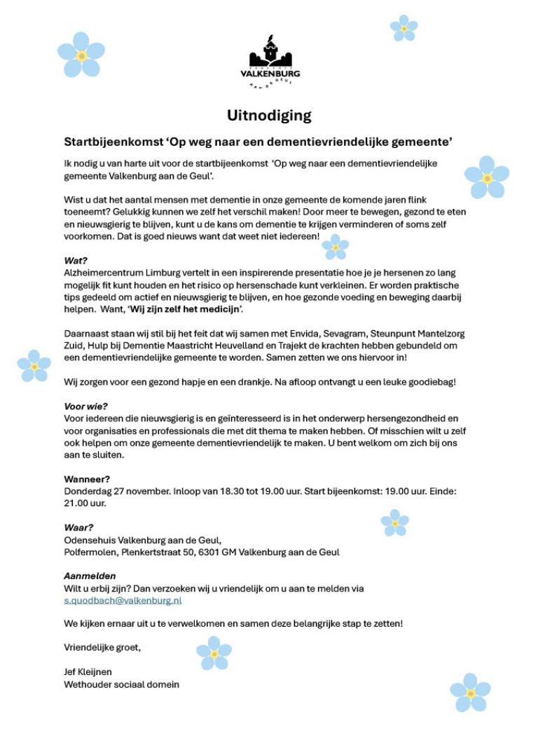Op donderdag 27 november organiseert gemeente Valkenburg de startbijeenkomst 'Op weg naar een dementievriendelijke gemeente Valkenburg aan de Geul. Vanuit het campagneteam zal dr. Colin Rosenau een lezing geven over het gezond houden van de hersenen.