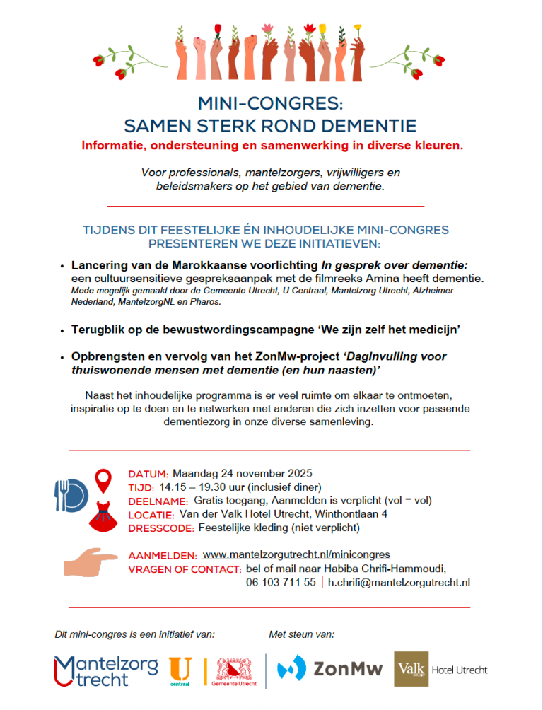 Op maandag 24 november vindt het mini-congres 'Samen sterk rond dementie' plaats van 14:15 tot 19:30 uur in het Van der Valk Hotel Utrecht.